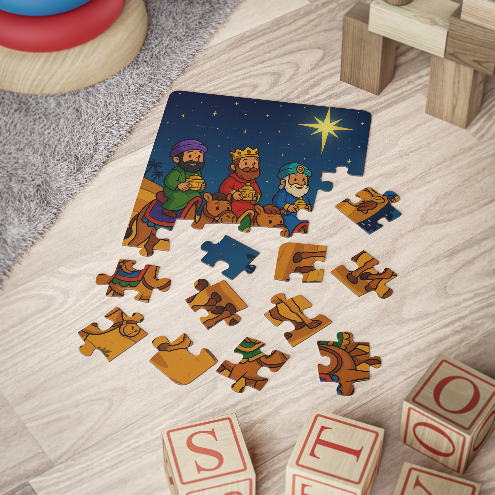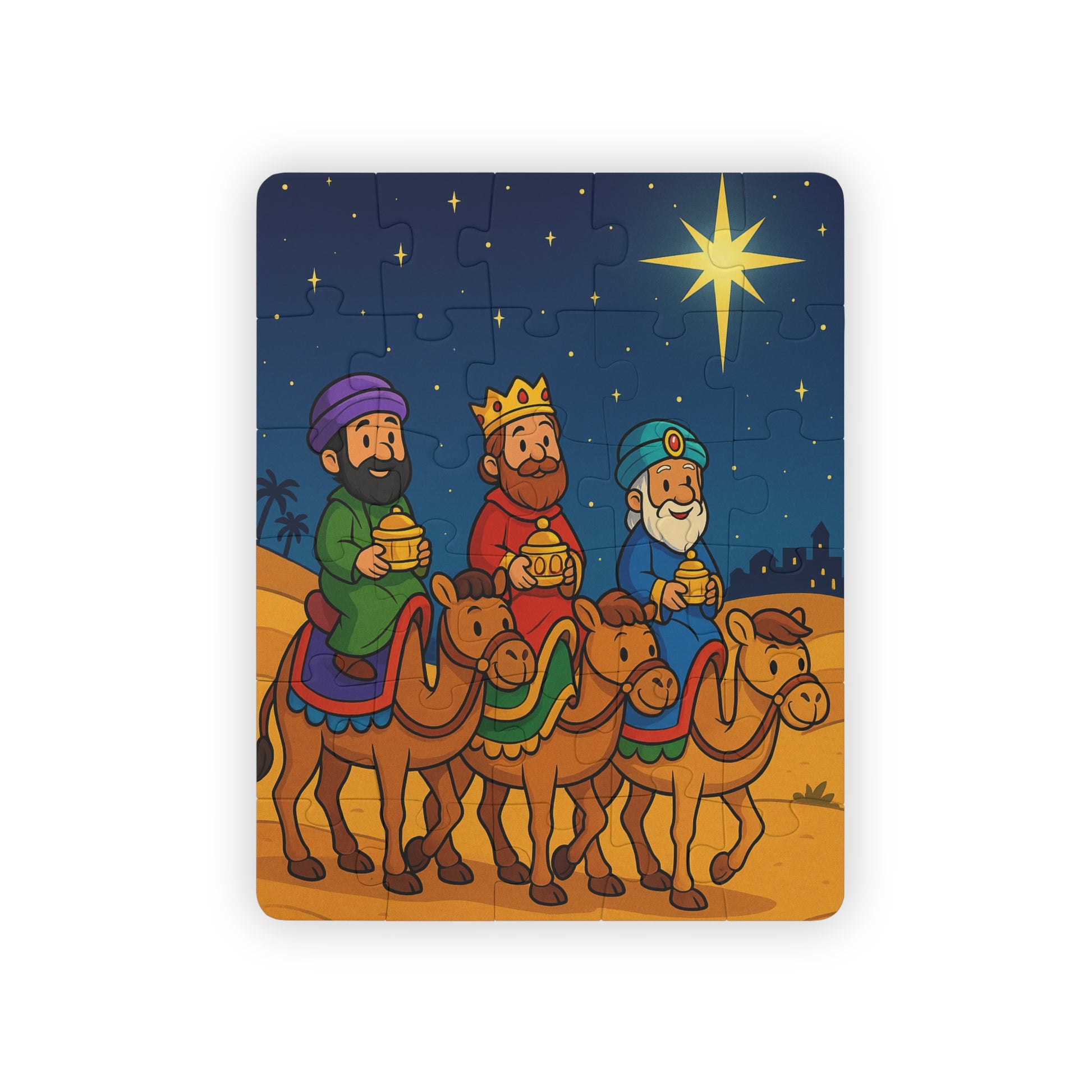 Follow the star across the desert with this 30-piece puzzle made for little ones ages 3–5. This cheerful scene features the Three Wise Men riding their camels, bringing gifts of gold, frankincense, and myrrh. With bright colors, friendly faces, and simple shapes, this puzzle is a joyful introduction to the Christmas story — perfect for teaching children about the journey of the Magi in a fun, hands-on way.