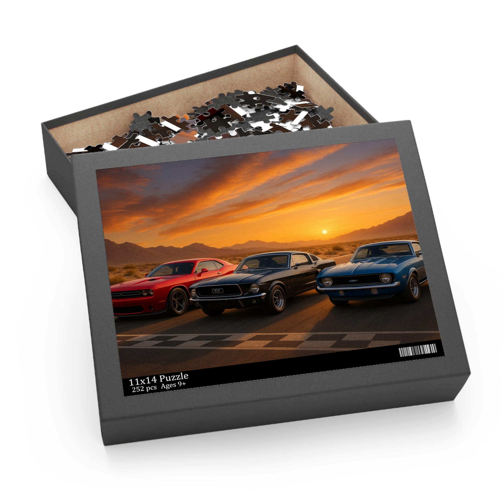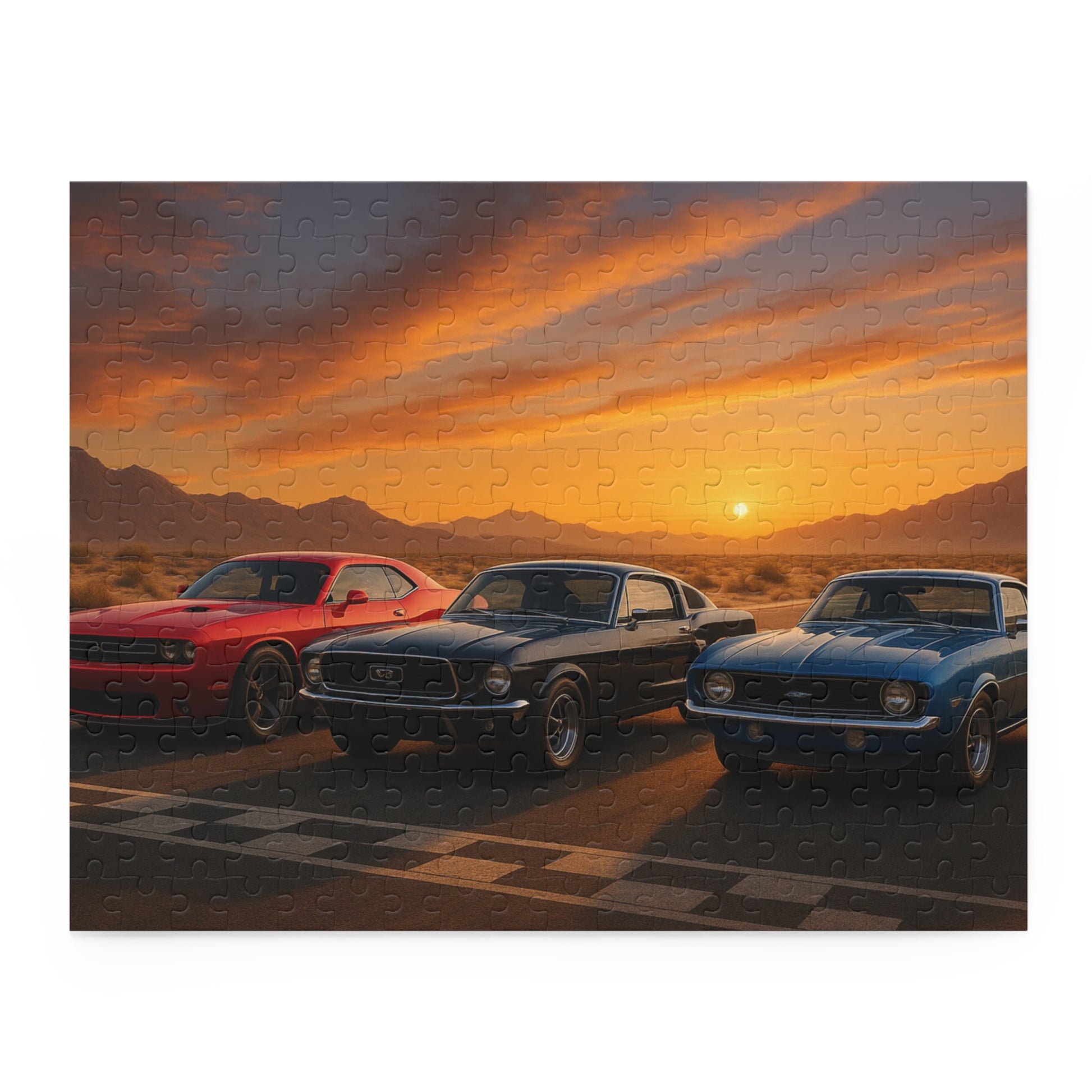 Ignite your child’s imagination with this high-octane 252-piece puzzle showcasing three legendary American muscle cars at sunset. Set against a dramatic desert racetrack backdrop, the vivid colors and iconic car designs make this puzzle a favorite for kids ages 8 to 13.